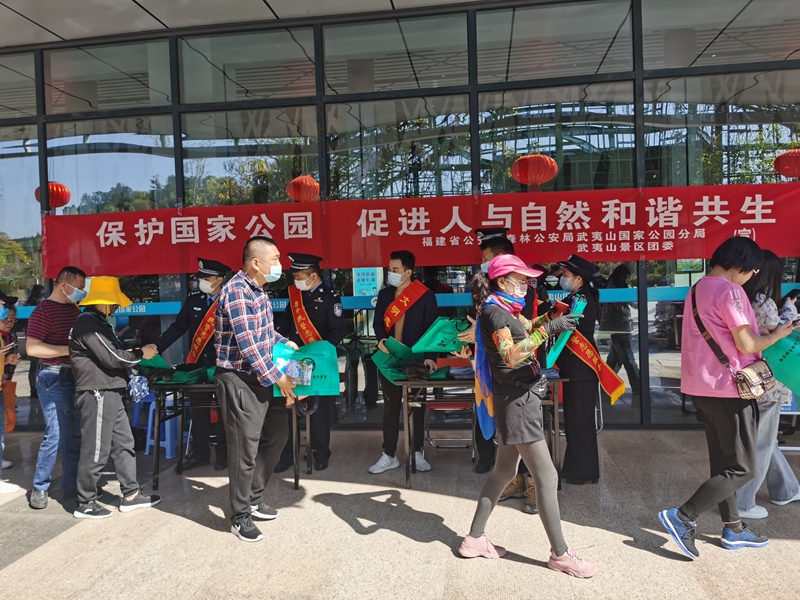 志愿服務(wù)現(xiàn)場,青年志愿者們向游客派發(fā)宣傳手冊(cè) 中共武夷山市委文明辦 供圖 東南網(wǎng)訊 3月26日,一場以“保護(hù)國家公園 促進(jìn)人與自然和諧共生”為主題的新時(shí)代文明實(shí)踐志愿服務(wù)系列活動(dòng)在武夷山景區(qū)南入口啟動(dòng)。 此次活動(dòng)由武夷山國家公園森林公安分局發(fā)起,協(xié)同武夷山景區(qū)團(tuán)委和武夷山市新時(shí)代文明實(shí)踐中心聯(lián)合策劃主辦。旨在通過一系列宣傳教育和巡查檢查等活動(dòng),深入推進(jìn)移風(fēng)易俗,引導(dǎo)人們堅(jiān)決擯棄濫食野生動(dòng)物的陋習(xí),守護(hù)綠水青山,共同營造武夷山景區(qū)文明健康新風(fēng)尚。 活動(dòng)現(xiàn)場,志愿者們通過懸掛主題橫幅、發(fā)放宣傳手冊(cè)、講解法律政策、組織林區(qū)巡查等方式向游客們宣傳森林防火、野生動(dòng)植物保護(hù)等法律知識(shí)。游客紛紛表示參加這樣的活動(dòng)很有意義,要從我做起、從現(xiàn)在做起,積極參與往后的野生動(dòng)植物保護(hù)公益行動(dòng),自覺做到不濫食野生動(dòng)物,愛護(hù)景區(qū)、公園的一花一木。活動(dòng)期間,游客們自覺手拎印有“拒食野生動(dòng)物、從我做起”“身在公園中,防火記心中”標(biāo)語的綠色環(huán)保袋列隊(duì)走在山中,成為了當(dāng)天景區(qū)里最閃亮的一道風(fēng)景線。