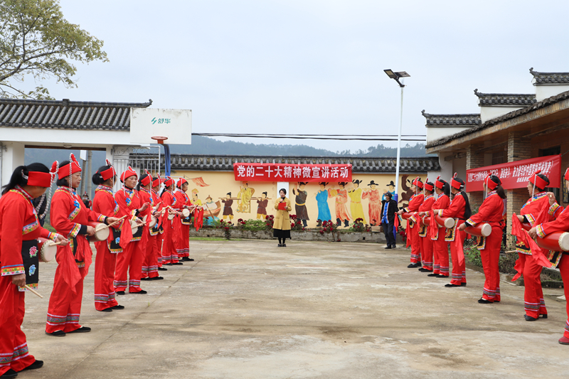 “福小宣·‘浦’新篇”宣講團(tuán)走進(jìn)富嶺鎮(zhèn)余塘村 浦城縣融媒體中心供圖 “黨的二十大春風(fēng)吹進(jìn)千萬家,民族團(tuán)結(jié)是福祉,幸福生活樂開花!”12月10日,浦城縣新時(shí)代文明實(shí)踐中心“福小宣·‘浦’新篇”宣講進(jìn)基層活動(dòng)走進(jìn)富嶺鎮(zhèn)余塘村。該村畬族民俗館里熱鬧非凡,畬族同胞們身著民族服飾盛裝,敲著鑼打著鼓,用畬語唱起了新時(shí)代的美好幸福生活,新時(shí)代微宣講員們慷慨而激昂的聲音,把黨的二十大精神傳播到少數(shù)民族群眾心中,讓最大同心圓“共鳴共振”。 活動(dòng)現(xiàn)場(chǎng),富嶺鎮(zhèn)6名微宣講員們用熱忱的言語、催人奮進(jìn)的聲音,表演了《黨的二十大之歌》詩歌朗誦;一位畬族村民用漢畬雙語講述了這些年來發(fā)生在身邊的變化,并用飽含深情的“畬音”唱響了贊美美好生活的畬族民歌;20名畬族婦女身著盛裝,為大家?guī)砹俗顬閭鹘y(tǒng)、質(zhì)樸而熱烈的腰鼓表演,隆隆鼓點(diǎn)激發(fā)了奮進(jìn)的腳步。 “作為浦城縣新時(shí)代微宣講員,今天非常地榮幸能夠?qū)Ⅻh的二十大精神送入基層。黨的二十大報(bào)告振奮人心、催人奮進(jìn),為大家的團(tuán)結(jié)奮斗指明了方向、路徑,今后會(huì)再接再厲,為大家?guī)砀泳实男v。”微宣講員謝慧文說。
