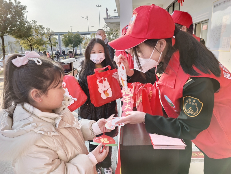 送“福”瞬間 宋琳玲 攝 2023年春運期間,福建高速南平管理分公司(以下簡稱“南平公司”)為進一步弘揚“奉獻、友愛、互助、進步”的志愿服務精神,深化精神文明建設,助力全國文明城市創建,傳播文明服務理念,積極組織黨員青年志愿者開展“志愿服務送關愛 文明實踐樹新風”文明實踐志愿服務活動。此次活動南平公司在全力打造收費站、服務區為基點的服務圈基礎上,不斷拓展志愿服務輻射面,通過與新時代文明實踐站點聯勤共建的方式,深入推進文明城市建設,組織志愿者下鄉鎮、進社區,探望老幼,慰問困難群眾,進一步倡導移風易俗、樹立文明新風,據統計,春運期間,南平公司共開展志愿服務66次,參與人數600余人次,累計服務時長1000余小時。志愿者們用真摯的服務溫暖了司乘返鄉路,用實際行動促進了文明風尚,讓文明之風吹暖閩北大地。