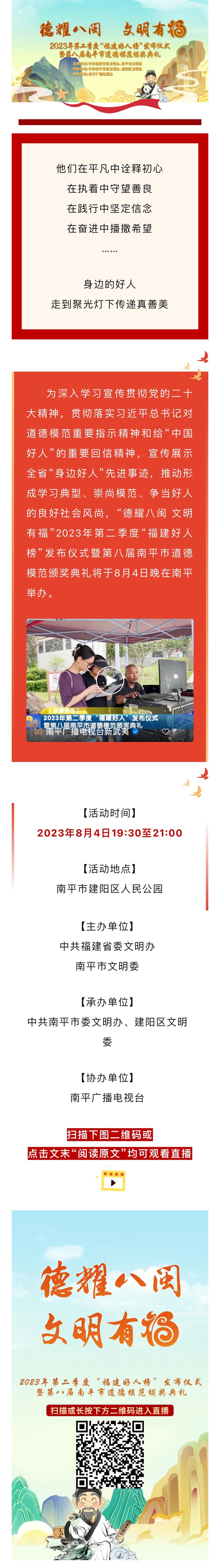 就在今晚!直播收看2023年第二季度“福建好人榜”發布儀式暨第八屆南平市道德模范頒獎典禮