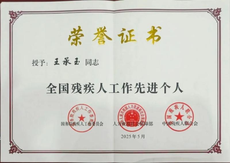 榮譽證書(由受訪者提供) “這份榮譽屬于所有基層助殘工作者。”5月16日,王承玉在北京人民大會堂接過“全國殘疾人工作先進個人”榮譽證書時表示。從肢體障礙的“追光者”到殘疾人心中的“引路人”,王承玉用十年如一日的堅守,在平凡崗位上走出一條充滿希望的助殘大道。她微跛的步履間,丈量的是對殘疾人事業的無限熱忱,書寫的是新時代基層工作者的最美答卷。(林晶 莊妍 張少杰) |