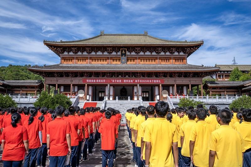 “明理崇德 尊師尚學——‘朱子故里·理學圣地’南平市2025年朱子敬師禮”活動在考亭書院舉行 吳大灼 攝 9日上午,“明理崇德 尊師尚學——‘朱子故里·理學圣地’南平市2025年朱子敬師禮”活動在建陽考亭書院舉行。建陽一中650余名師生參加活動。 在考亭書院集成殿,學生們行鞠躬禮,緬懷中華先賢;學生代表向老師呈敬師帖,表達尊師心聲;在行釋菜禮環節,學生代表將芹菜、蓮子、紅豆、棗子、桂圓、肉干六樣各有寓意的果蔬菜羹敬送給老師,老師回贈《白鹿洞書院揭示》卡片;最后,學生們齊誦朱熹《白鹿洞書院揭示》,弘揚尚學之道。