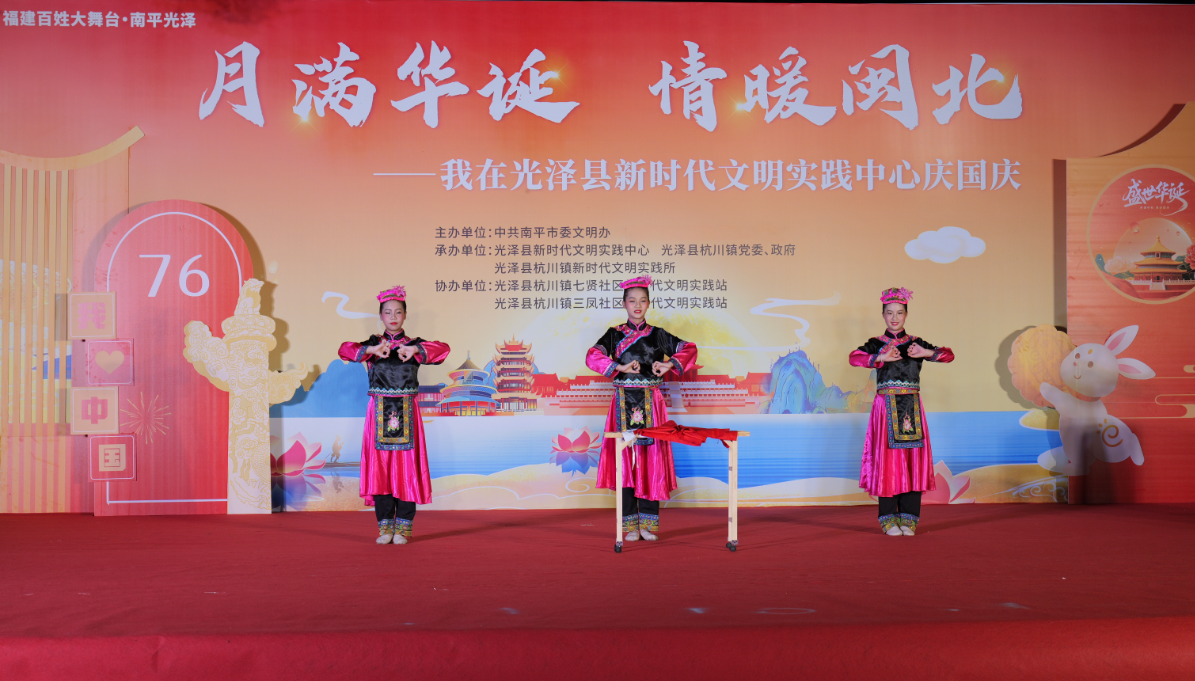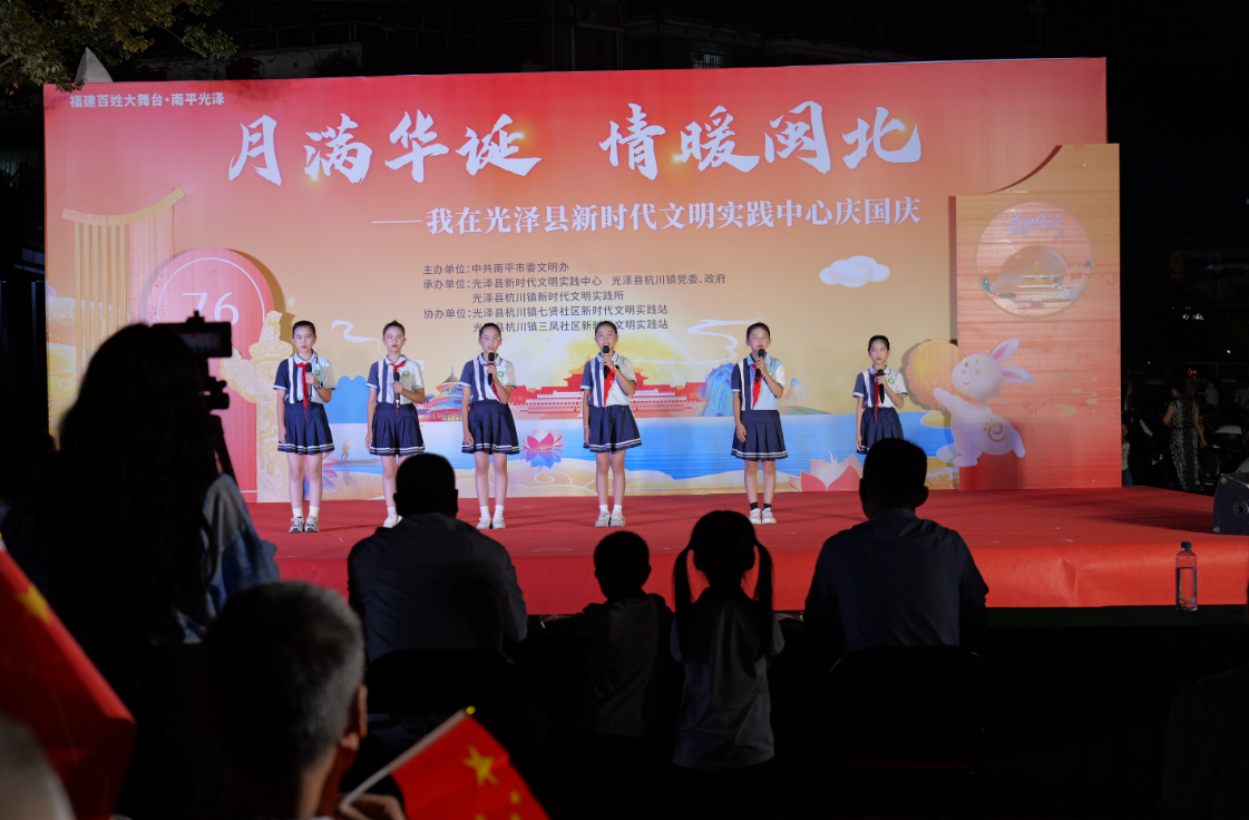 活動現場 9月29日晚,由南平市委文明辦主辦,光澤縣新時代文明實踐中心、光澤縣杭川鎮黨委政府、光澤縣杭川鎮新時代文明實踐所承辦的2025年“月滿華誕 情暖閩北”主題活動在光澤縣中山臺舉行。 活動現場節目精彩紛呈且浸潤文明底色,全國文明村鎮光澤縣杭川鎮的“佳家”廣場舞志愿服務隊以《東方紅》腰鼓表演展現老年群體風貌,傳遞紅色文明;俏丫丫等舞蹈機構舞者用靈動舞姿訴說對未來的憧憬與對祖國的贊頌,融入“向上向善”的文明追求;古箏演奏與書法創作同步呈現,讓中華傳統文化的文明基因直觀可感;鎮嶺小學學子朗誦《少年中國說》,激發青少年“強國有我”的擔當。其間穿插《南平市文明行為促進條例》及雙節知識搶答,居民在互動中輕松學習文明準則。最后,全體參與者手持小國旗合唱《歌唱祖國》,臺上臺下情感呼應,凝聚起“愛黨愛國、崇德向善”的共識。