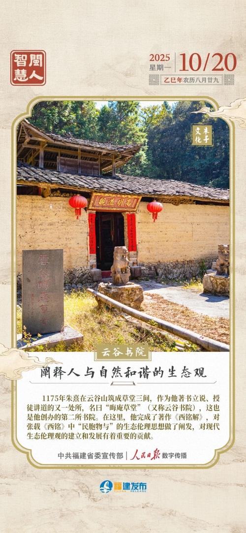 1175年朱熹在云谷山筑成草堂三間,作為他著書立說、授徒講道的又一處所,名曰“晦庵草堂”(又稱云谷書院),這也是他創辦的第二所書院。在這里,他完成了著作《西銘解》,對張載《西銘》中“民胞物與”的生態倫理思想做了闡發,對現代生態倫理觀的建立和發展有著重要的貢獻。